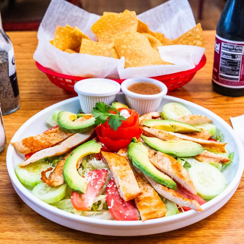 Bed of iceberg lettuce, sliced tomatoes, avocado and cucumber; then topped with marinated grilled chicken. Goes with ranch dressing on the side.