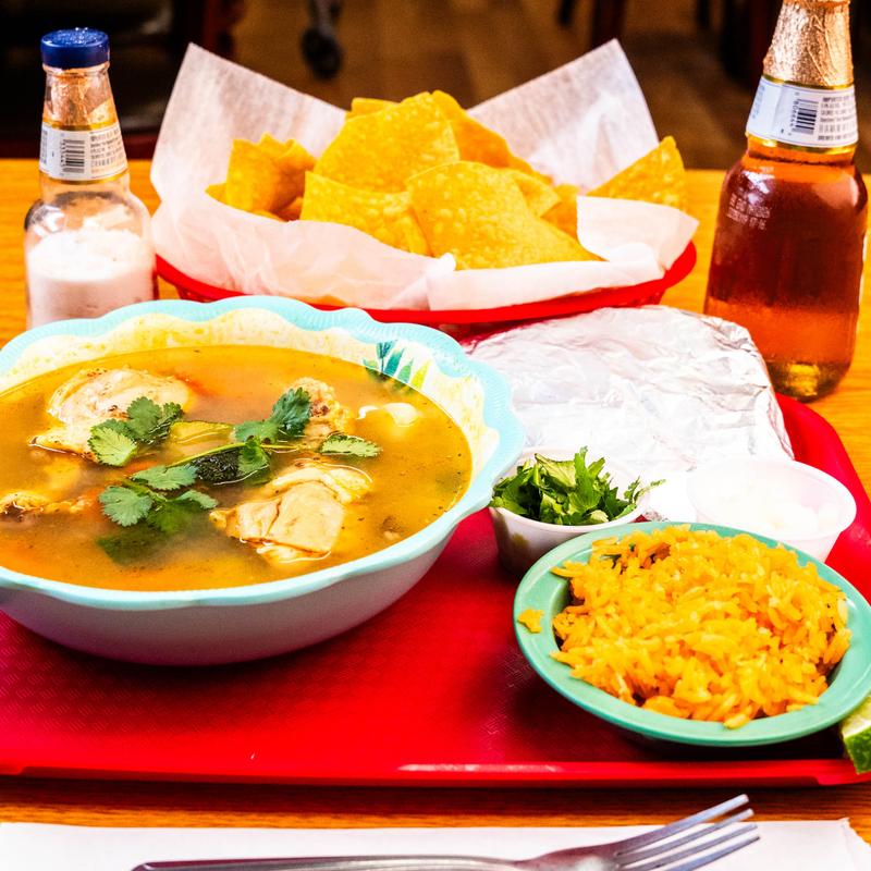 Soup made with 2 chicken legs and vegetables. Served with rice, cilantro, raw onion, lime wedge and tortillas.