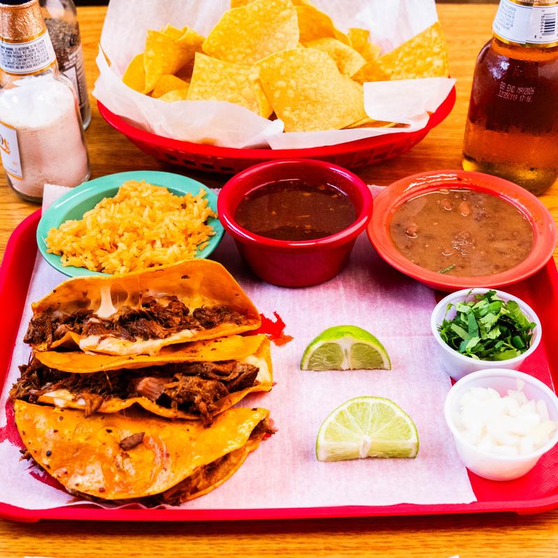 3 regular tacos with 1 meat. Includes charro beans and rice.