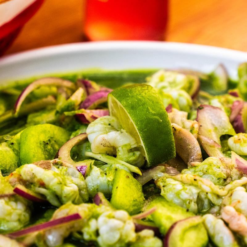 Aguachile - Fresh shrimp, fish, or combination marinated in chili-lime sauce, served chilled.