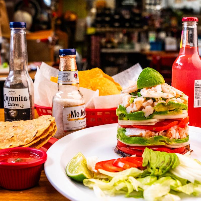 Seasoned tender steak, 6 large shrimp and whole Cactus grilled to perfection and stacked together, served with rice, beans, guacamole salad, Mexican grilled veggies and tortillas, Wow !