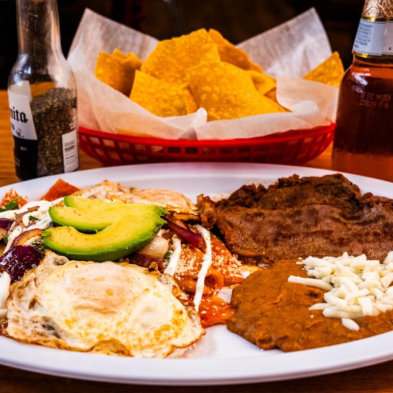 Corn Tortilla drowned in Sauce of your choice, topped with cheese, red onion, sour cream, avocado and cilantro. Served with Grilled Steak and refried beans.