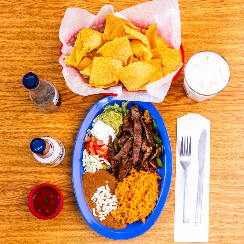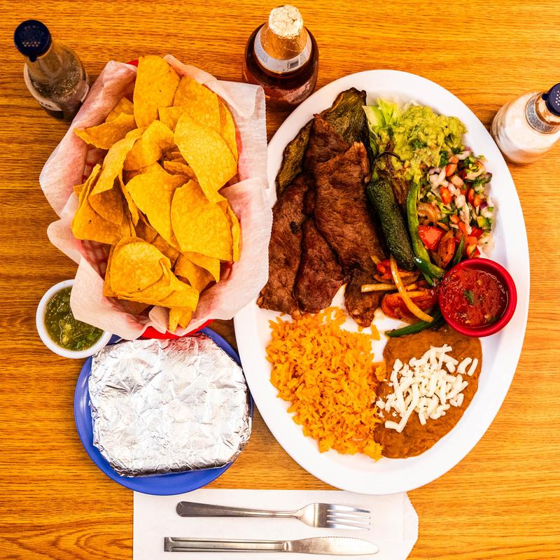 Your choice of protein Grilled and cooked with Fajita veggies, served with rice, beans, Tortillas, Guacamole salad and sour cream.