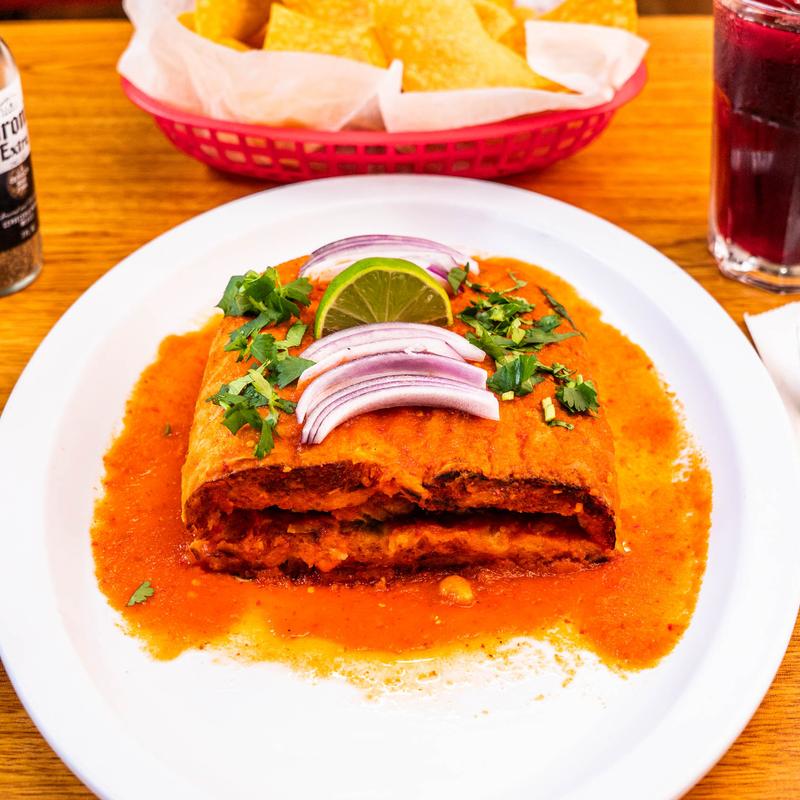 2 flour tortillas filled with meat, topped with red sauce and melted cheese. Served with rice and beans.