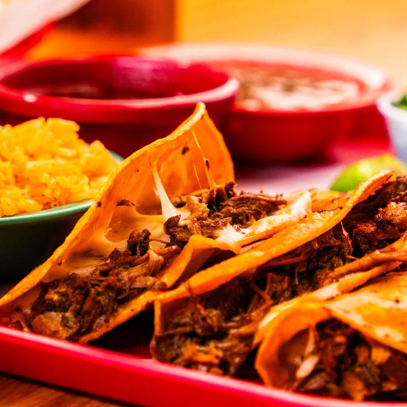 3 corn Tortillas filled with cheese and birria meat, soaked on birria broth and flat grilled. Served with rice, charro beans, cilantro, onion, lime wedge and birria broth to dip.